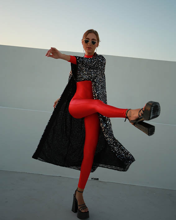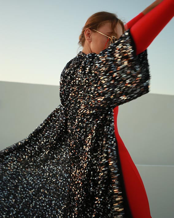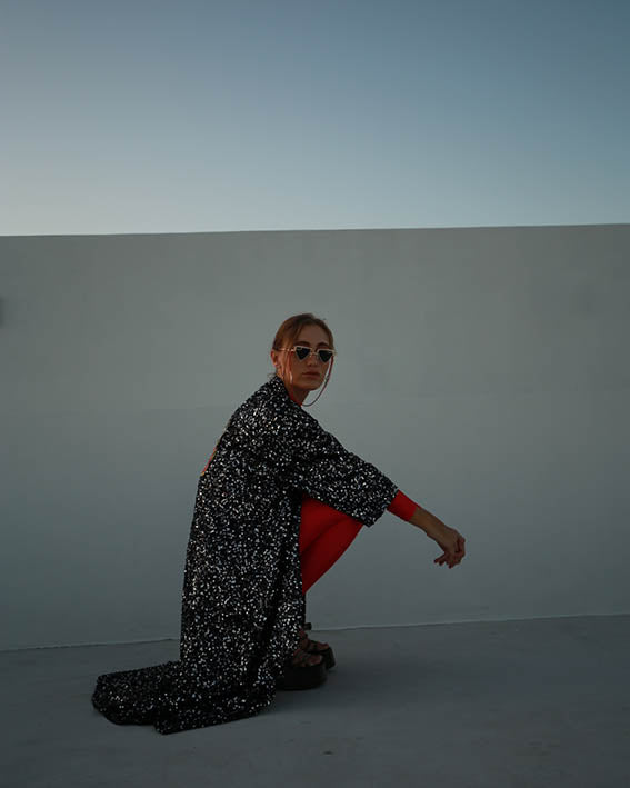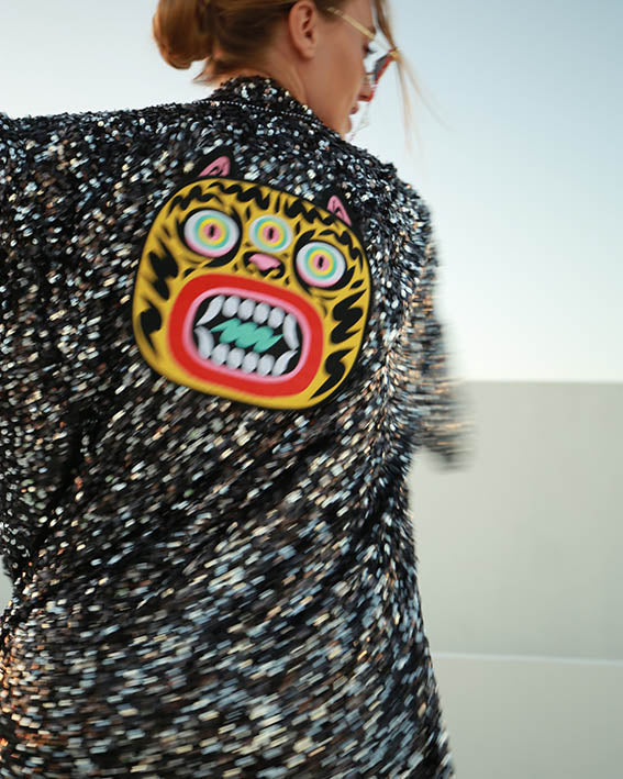 Con lentejuelas negras y plateadas y un diseño psicodélico de tigre en la parte de la espalda, este kimono es una pieza de arte que aporta una sofisticación moderna y vanguardista a cualquier look.